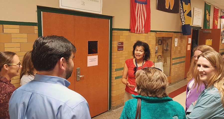 The group made its first stop at Bennett Elementary School which is well known for the quality of its teaching staff and which is working closely with CEHHS in the revival and upgrade of their library. Community School Site Coordinator at Bennett Kaity Nicastri who is part of the School Library Project, was the host during the walk-through of the Pre-K-5 facility.